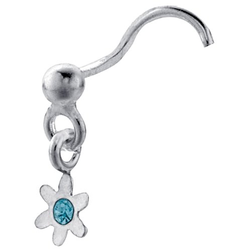 925 STERLING SILVER DANGLE NOSE RING BODY JEWELRYA cute 925 sterling silver flower dangle nose ring with a flawless aqua CZ gem inlay. These beautiful nose rings adds a refined touch of elegance to anyone with a piercing. The three different colors available guarantees that these nose rings will go great with any wardrobe or mood. Each nose ring barbell is made from the best 316L surgical grade stainless steel polished to a mirror shine. 316L surgical grade steel is the preferred metal for body jewelry to avoid any un-necessary irritation.Barbell Size: 18 Gauge (1.0mm)Barbell Diameter: