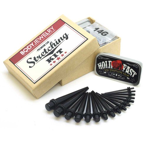 16 Piece Black Acrylic Ear Taper Stretching Kit. Stretch your ears with our 16 Piece Black Acrylic Ear Taper Stretching Kit, start with size 14G, slightly larger than a regularly pierced ear, to (0G - 8mm). There are two tapers, one pair, in each size that comes in the kit. Each taper comes with pair of double o-rings.